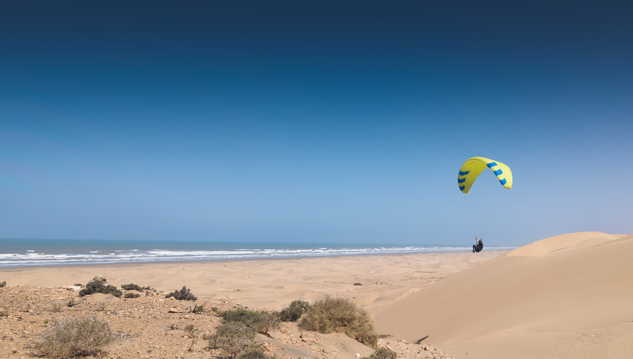 Nicht nur das ausgeglichene Klima mit Temperaturen um die 20 Grad verlocken GleitschirmpilotInnen dazu die kalte Schweiz um diese Jahreszeit zu verlassen, auch fliegerisch hat Marokko so einiges zu bieten. Dynamisches Küstensoaren und atemberaubende Thermikflüge im Landesinneren lassen Pilotenherzen höher schlagen. Die kulinarischen Genüsse der orientalischen Küche sind bei all dem nicht zu vergessen. Hinzu kommen romantische Sonnenuntergänge und Essen bei Kerzenlicht. Ein zauberhaftes Land! FLIEGERISCHES PROGRAMM Fliegerisch bietet Marokko alles was das Herz begehrt: Viel Thermikfliegen zu Beginn der Reise, anschliessend Küstensoaring und Dünenfliegen, dies alles gemischt mit Groundhandling bei jeder sich bietenden Gelegenheit. Die Rundreise setzt sich wie folgt…